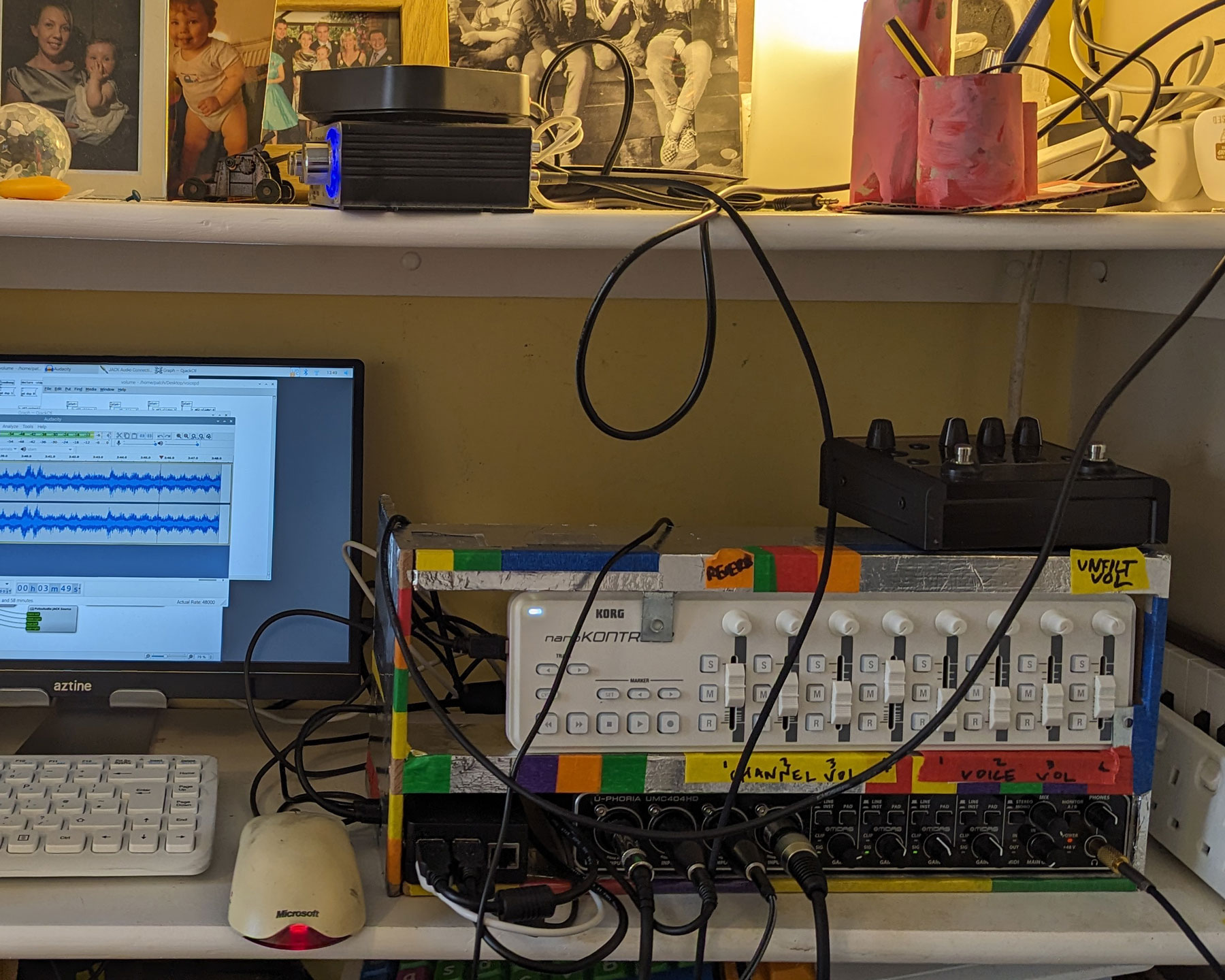 It is a live stream investigating how a space can be given a voice. This voice is produced using mics and sensors to sonify multiple objects and devices within the space. These sounds are combined and processed using Pure Data and sent to an Icecast2 server.